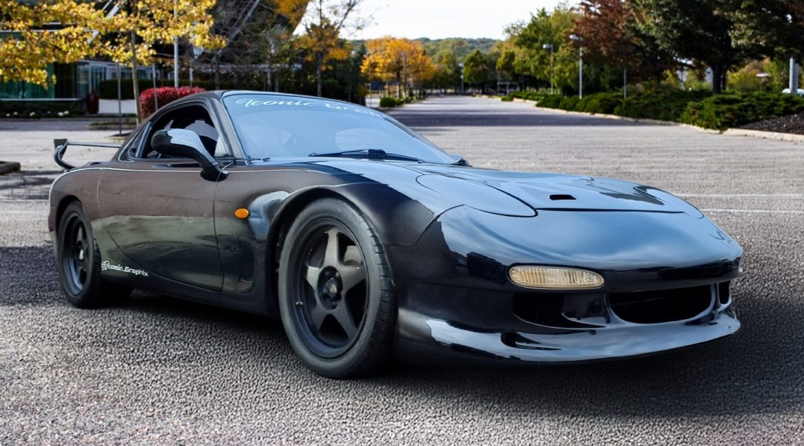 3rd generation FD3s Mazda rx7. The motor is a single turbo modified rotary with exhuast. The car has a carbon fiber hood and spoiler with a aftermarket front bumper and wheels. The car is black on black on black. The interior has a bolt in cage, gauges up the drivers...