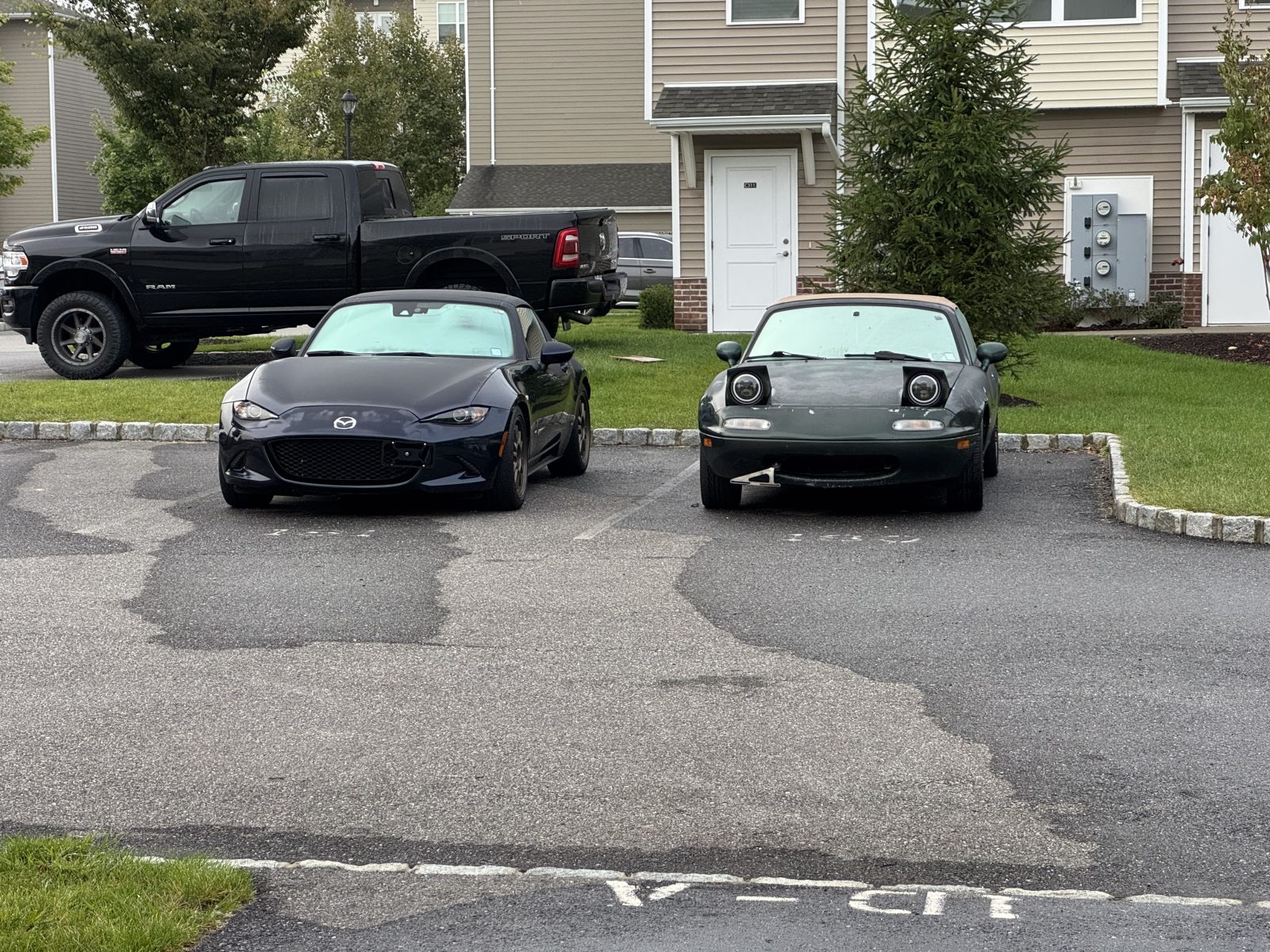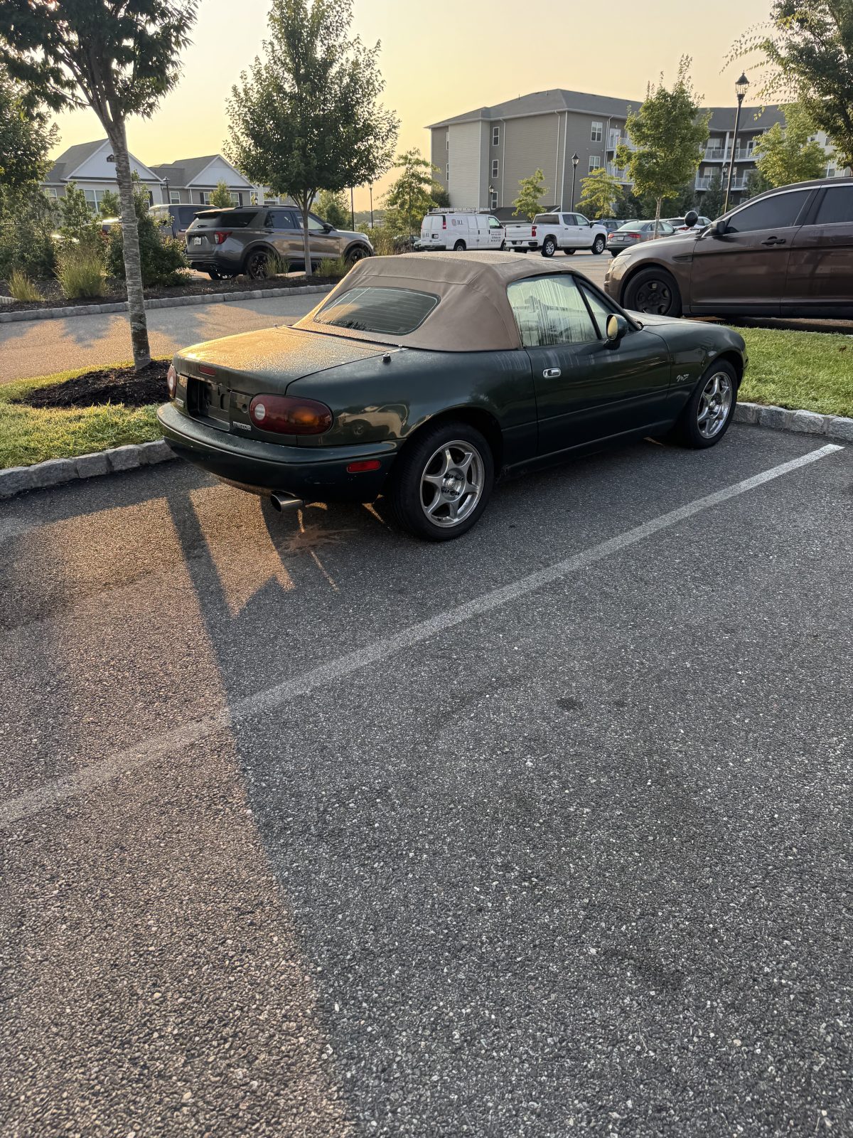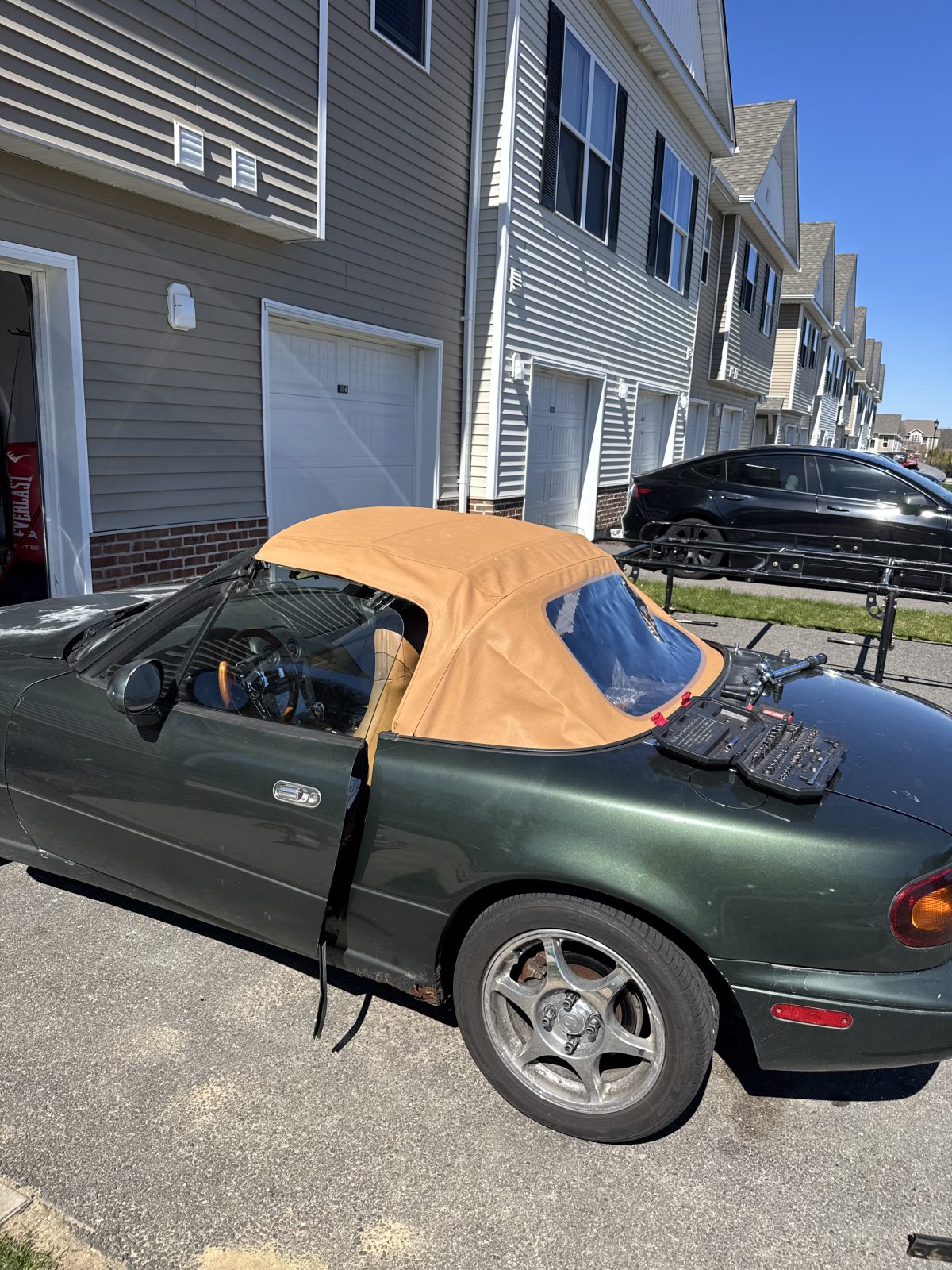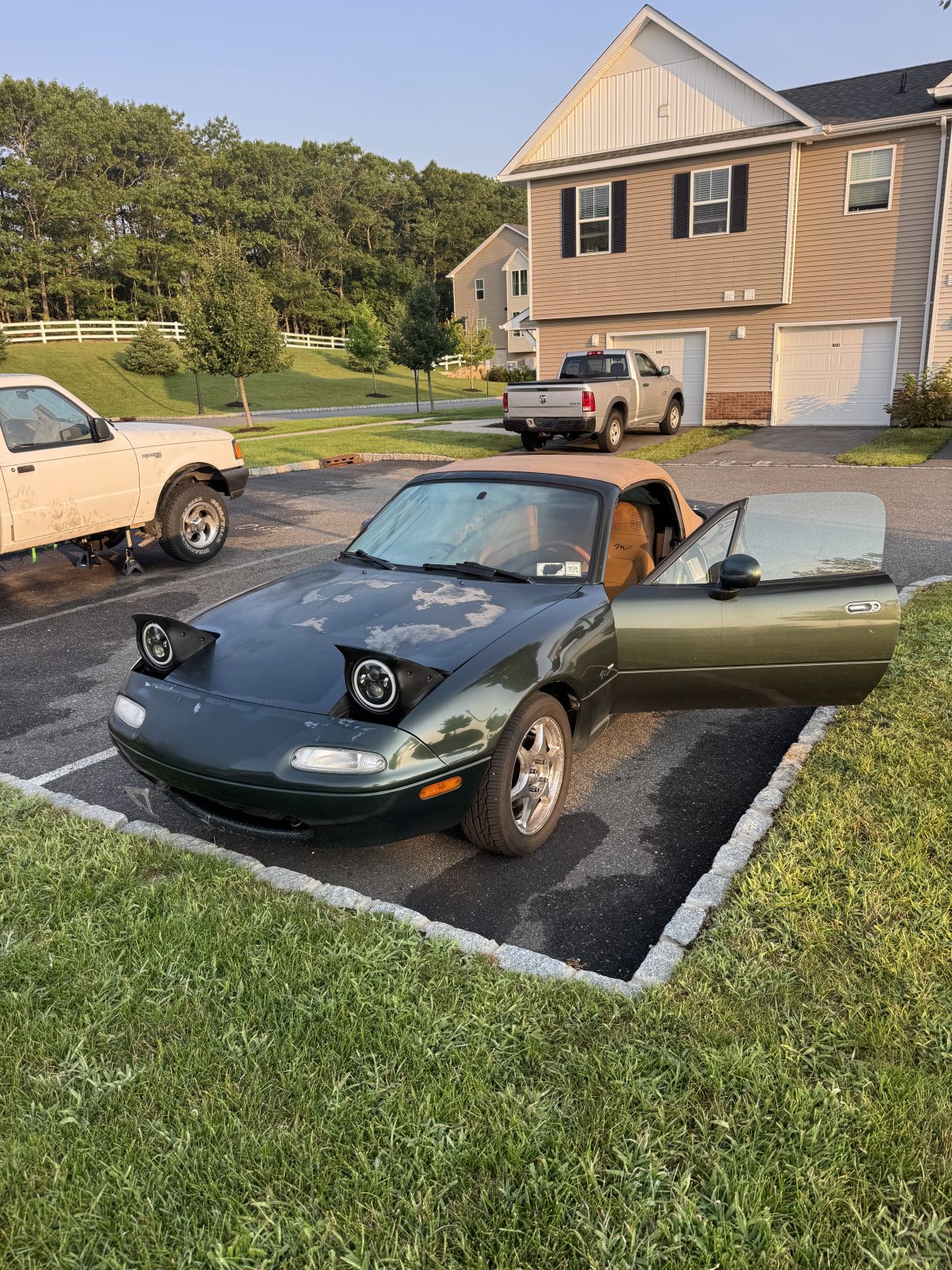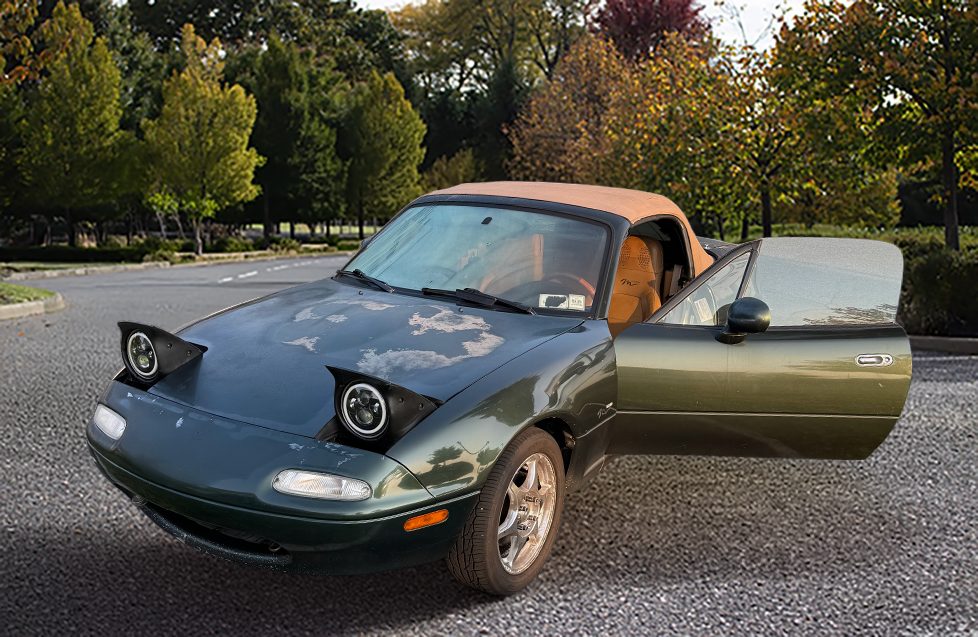 Green Mazda Miata, tan convertible top, pop-up headlights. Manual Transmission.
