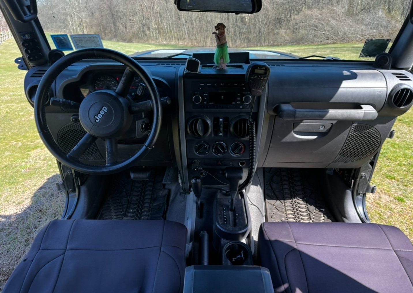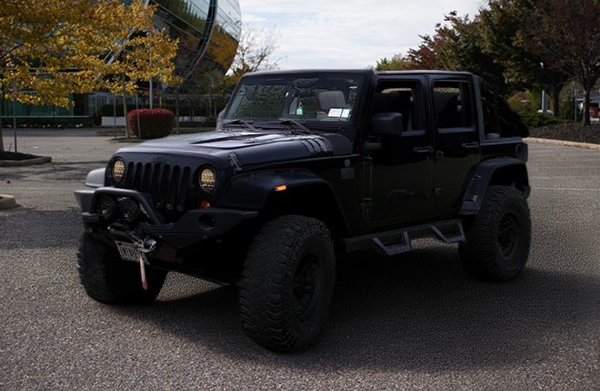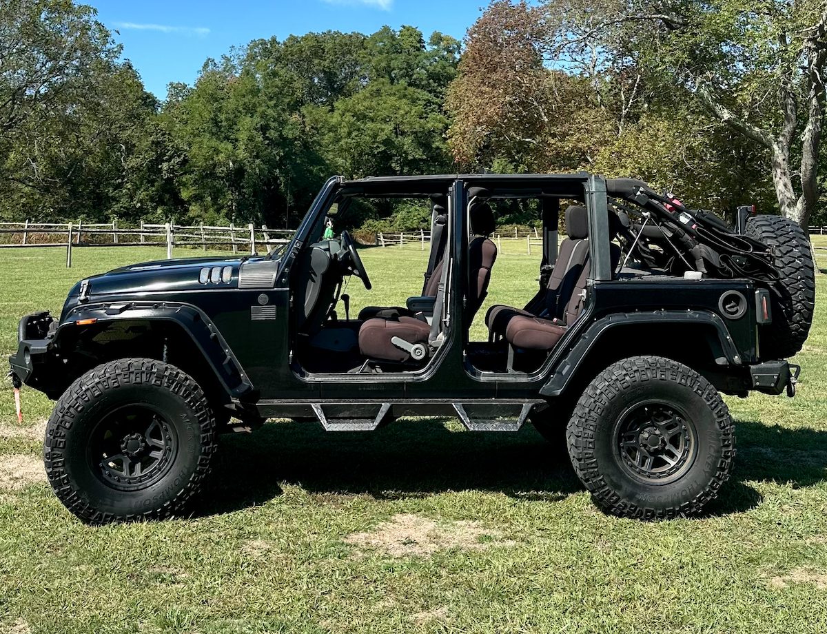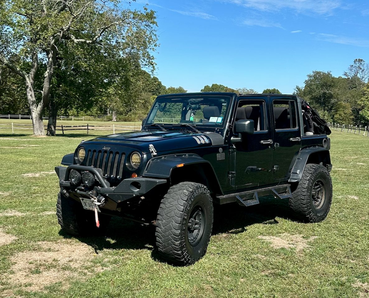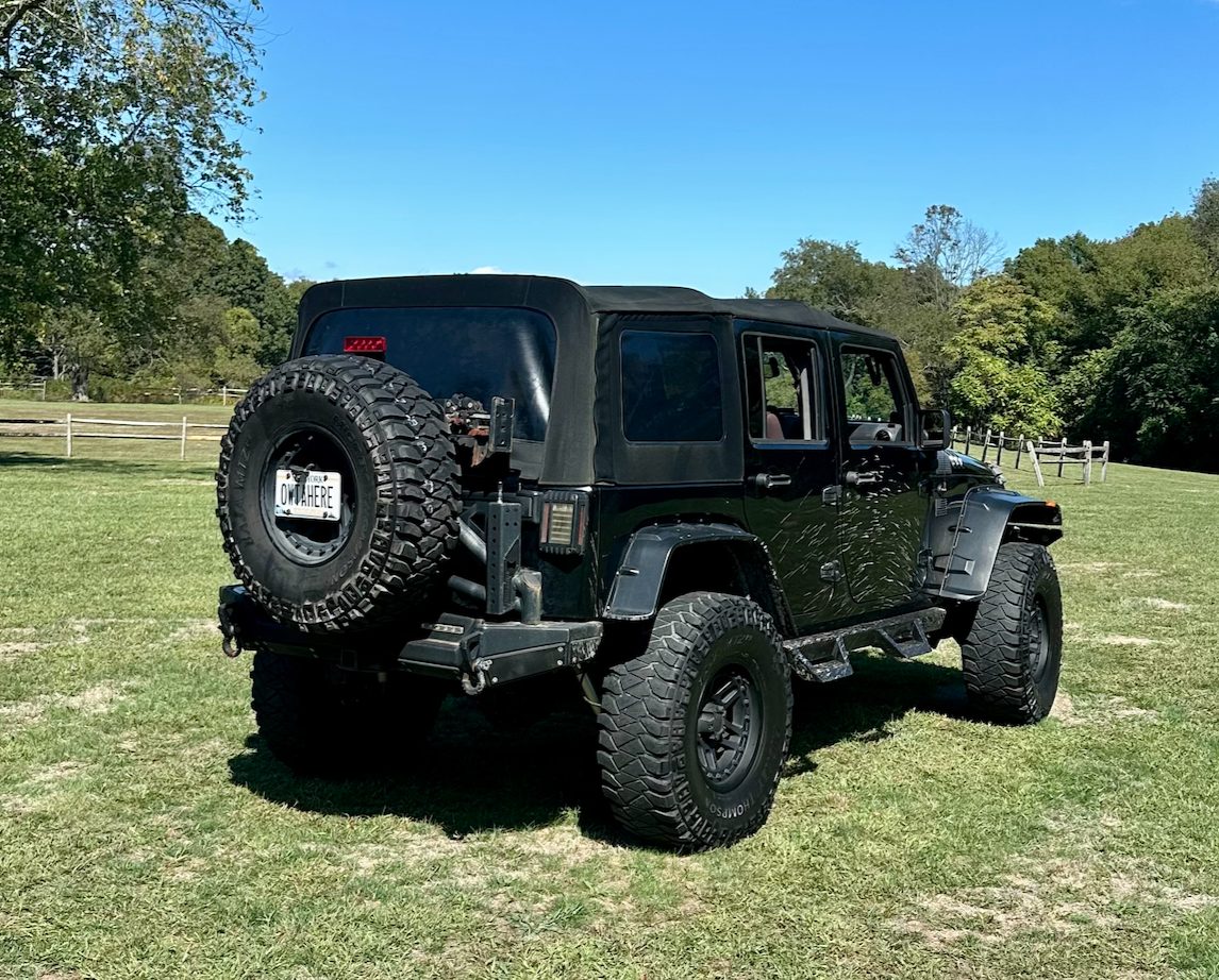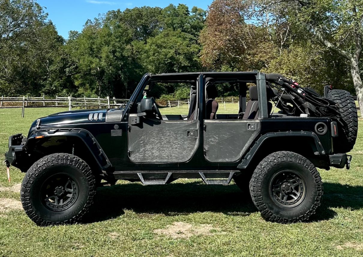 2008 4 door Jeep Wrangler with a 4.5″ lift, 37″ tires, winch, steel bumpers, rear trunk, full doors, half doors, soft top