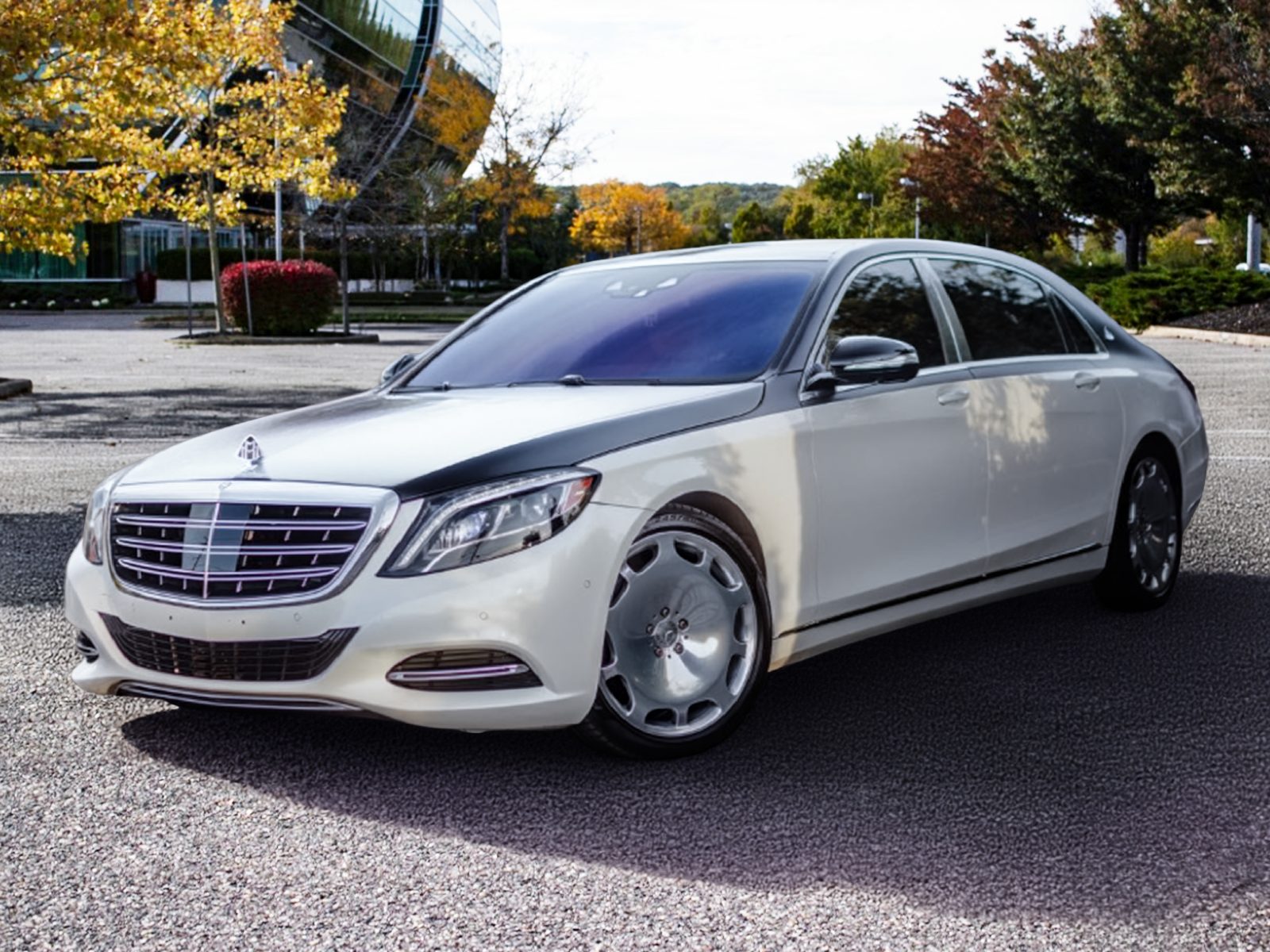 Two-tone black and white exterior with a beige interior. Rear massaging, cooled, and heated seats with TV’s.