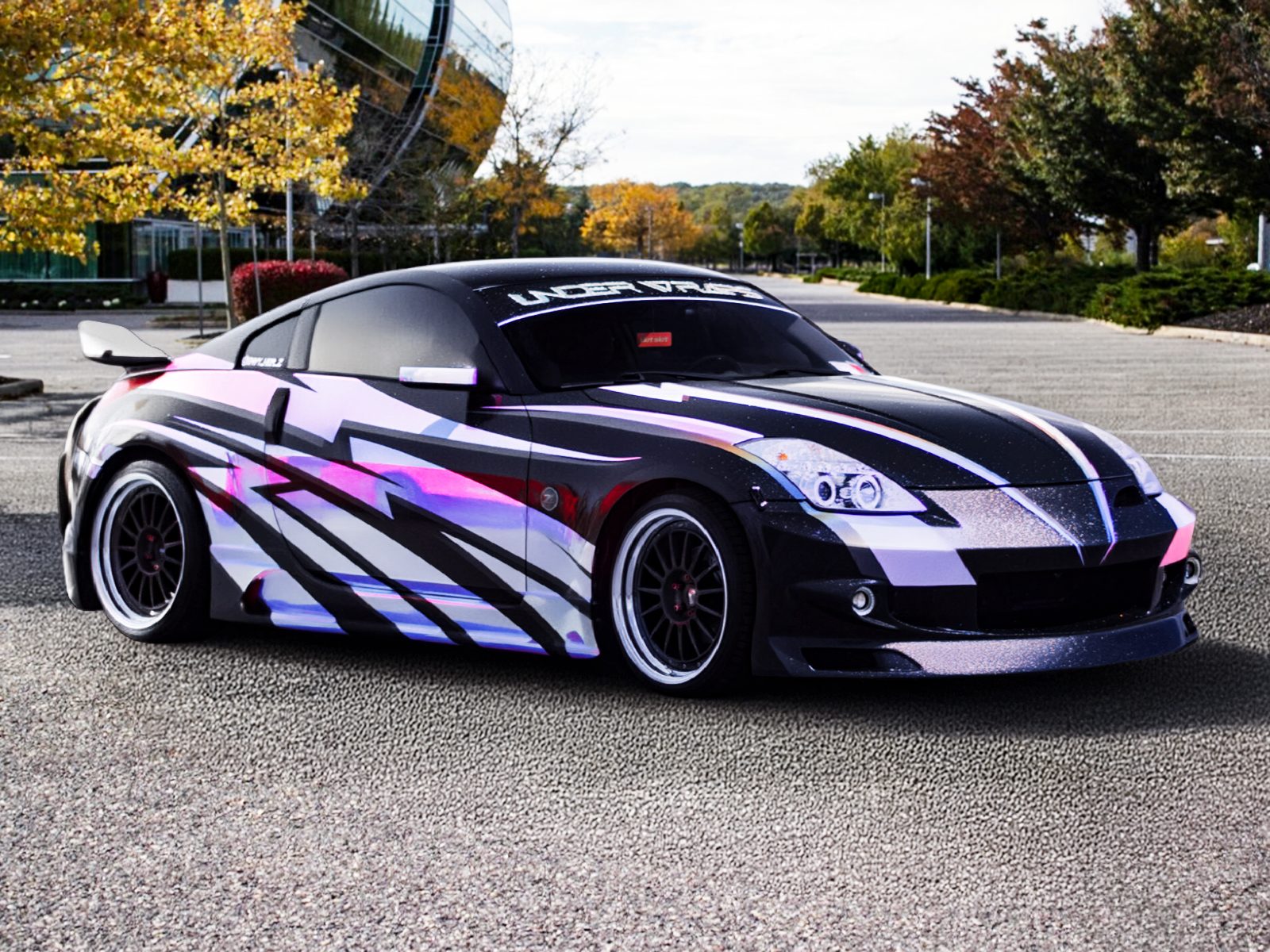 Nissan 350z 2dr coupe with a body kit, vinyl wrap, aftermarket steering wheel, shift knob and exhaust modifications
